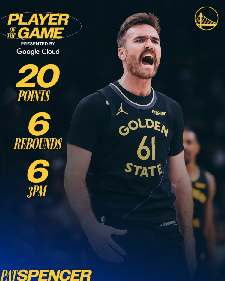 赛后勇士官方发布本场最佳球员数据海报,斯潘塞当选。
