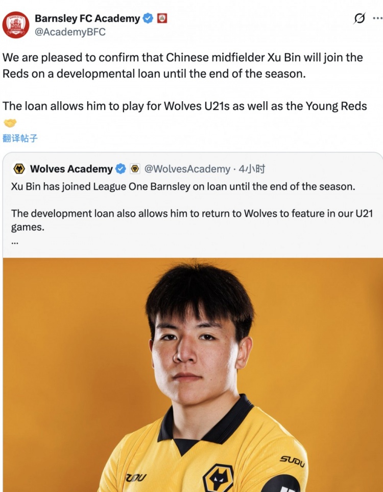 巴恩斯利官方:我们很高兴地确认,中国中场球员徐彬将以租借形式加盟,直至本赛季结束。