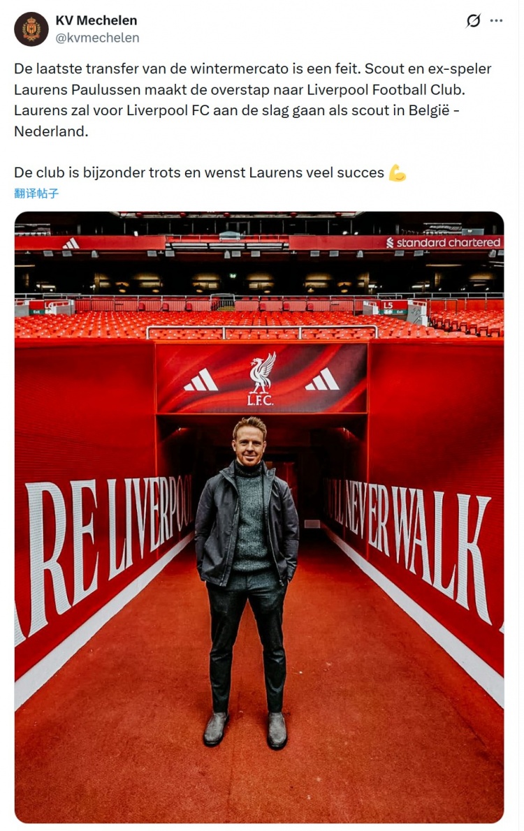 24直播网2月7日讯 梅赫伦俱乐部官方宣布,球探劳伦斯·保卢森加盟利物浦。