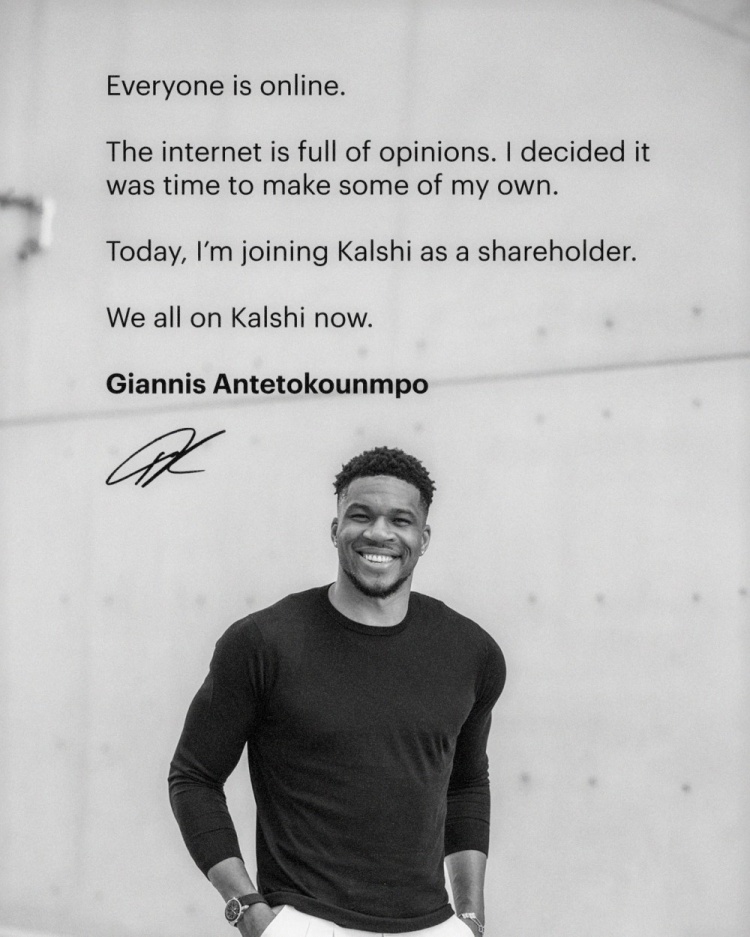 24直播网2月7日讯 今日雄鹿球星字母哥宣布,自己将以股东身份加入体育预测平台Kalshi Sports。