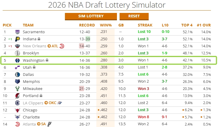 奇才目前战绩联盟倒数第五,状元签概率10.5%,自己的首轮签前八保护。