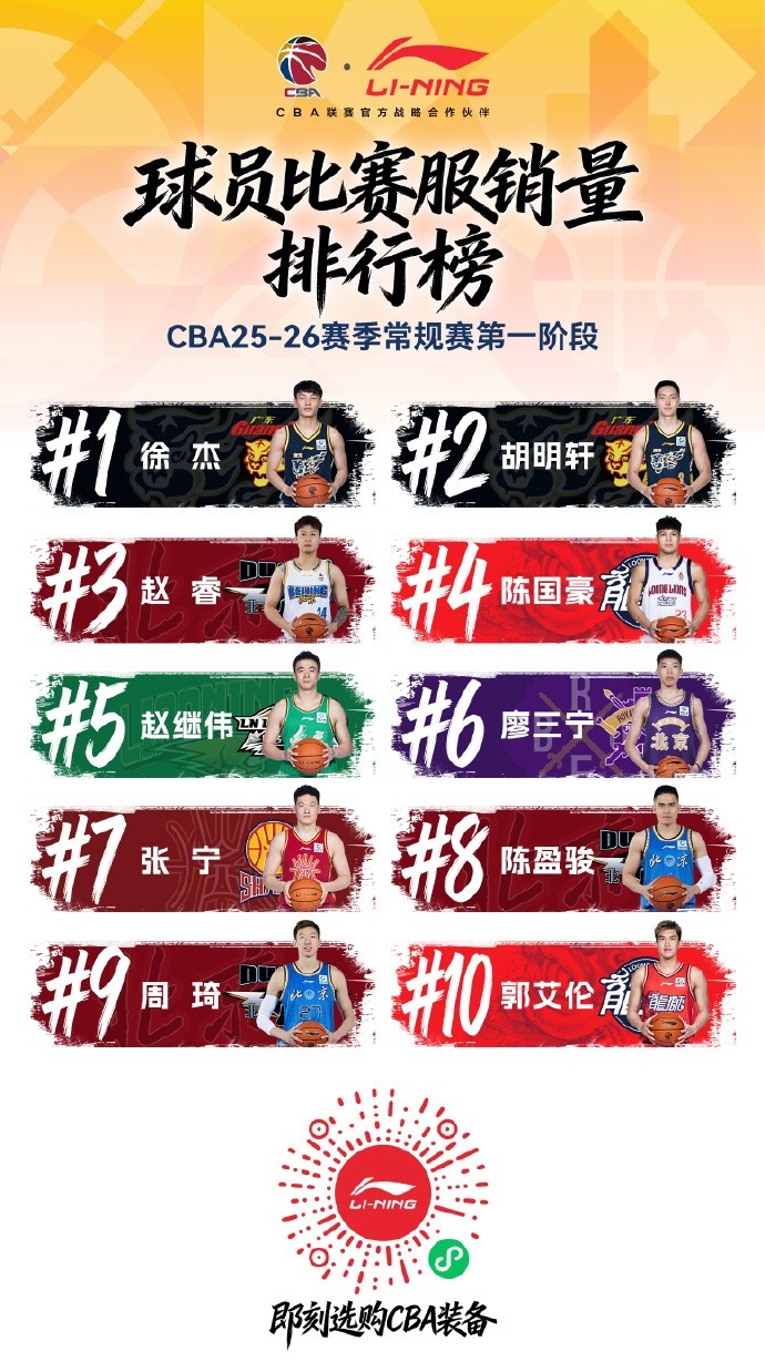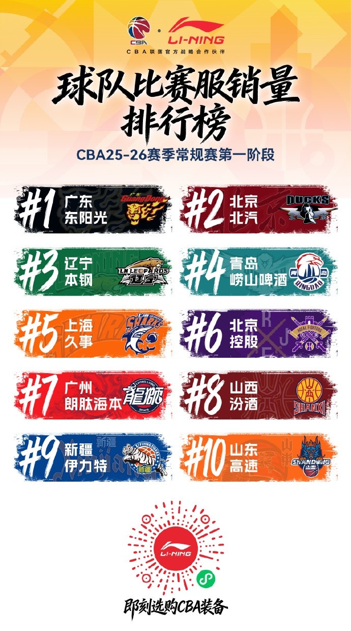 24直播网2月7日讯 今天,李宁公布了常规赛第一阶段球员球衣销量TOP10以及球队球衣销量TOP10。