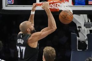 此役,戈贝尔出战33分钟,投篮12中5,罚球4中2,得到12分16篮板2助攻3抢断2盖帽,包括7进攻板。