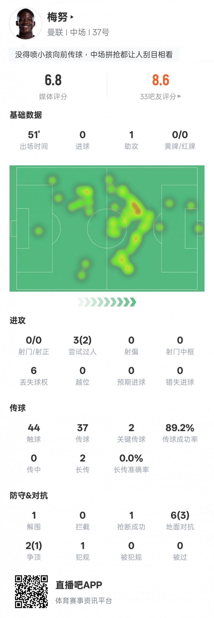 24直播网2月7日讯 英超第25轮焦点战,曼联主场迎战热刺,上半场曼联暂1-0领先。梅努首发出战,送出1次助攻,2次关键传球,还有2次过人成功,半场评分6.8。