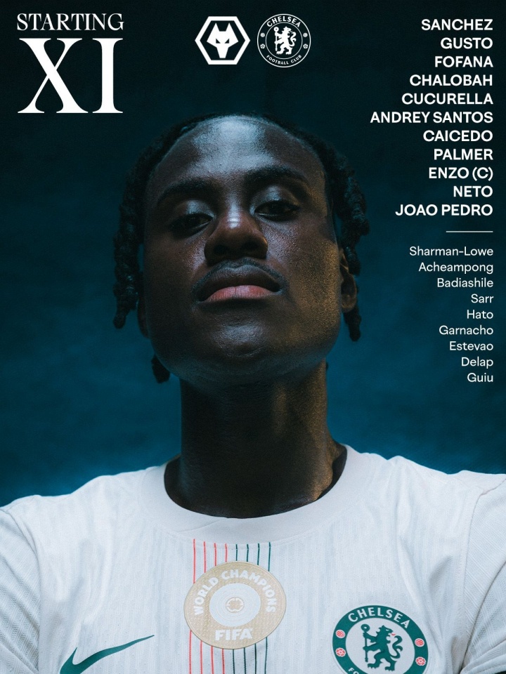 切尔西首发:桑切斯、古斯托、福法纳、查洛巴、库库雷利亚、桑托斯、凯塞多、恩佐、帕尔默、内托、佩德罗