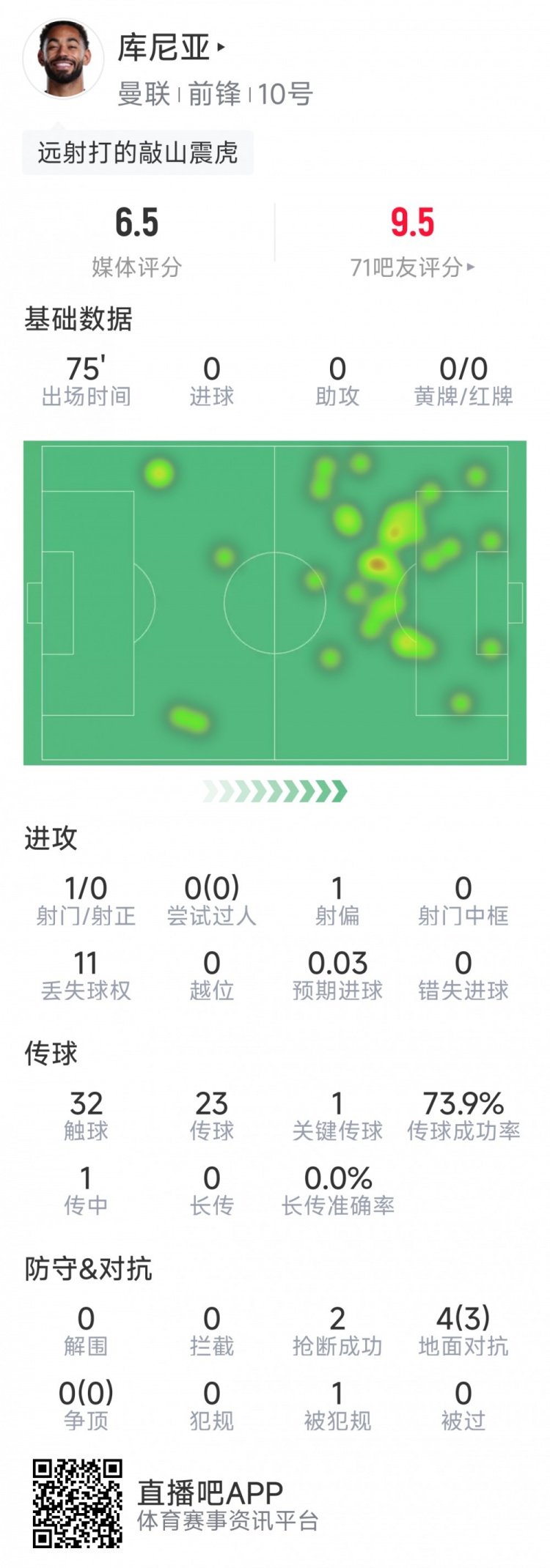 24直播网2月7日讯 在本轮英超曼联对阵热刺的比赛中,库尼亚首发出场,以下为他在本场数据: