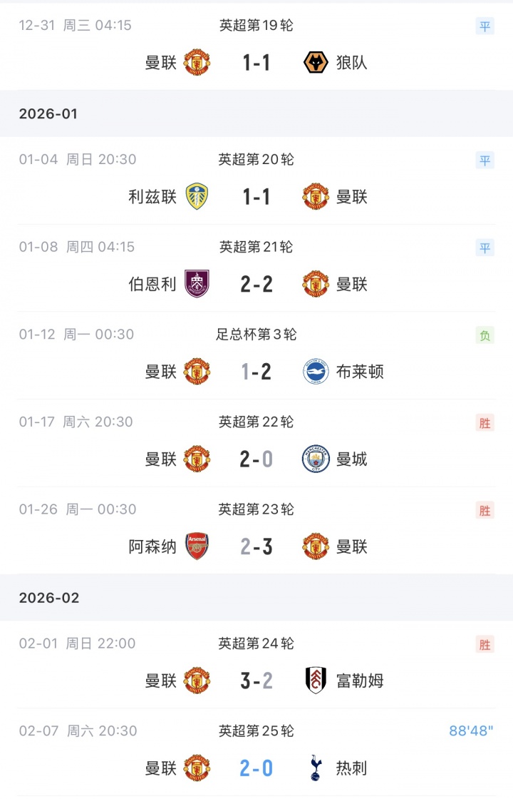 24直播网02月07日讯 1月14日,曼联官宣卡里克出任球队临时主帅,上任前球队连平狼队、利兹联、伯恩利,足总杯输给了布莱顿,卡里克上任首战2-0曼城,此后连克阿森纳、富勒姆和热刺!