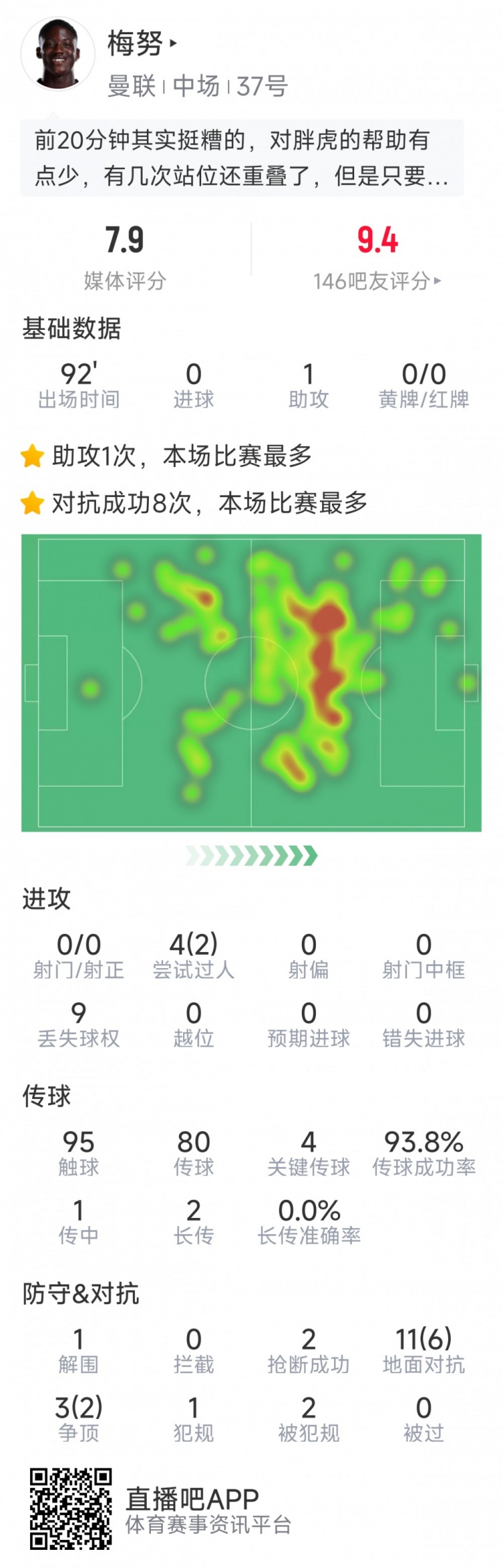 24直播网2月7日讯 在本轮英超,曼联2-0击败热刺,以下为梅努本场数据: