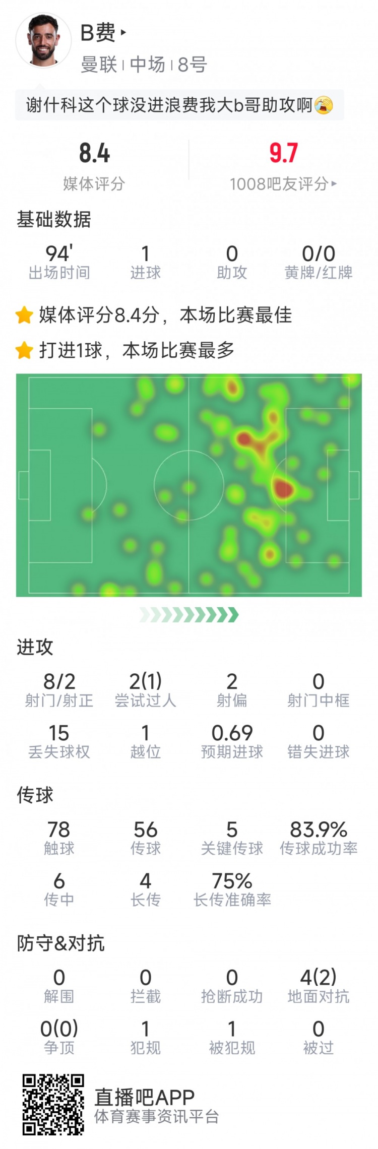 24直播网2月7日讯 在本轮英超,曼联2-0击败热刺,以下为B费本场数据: