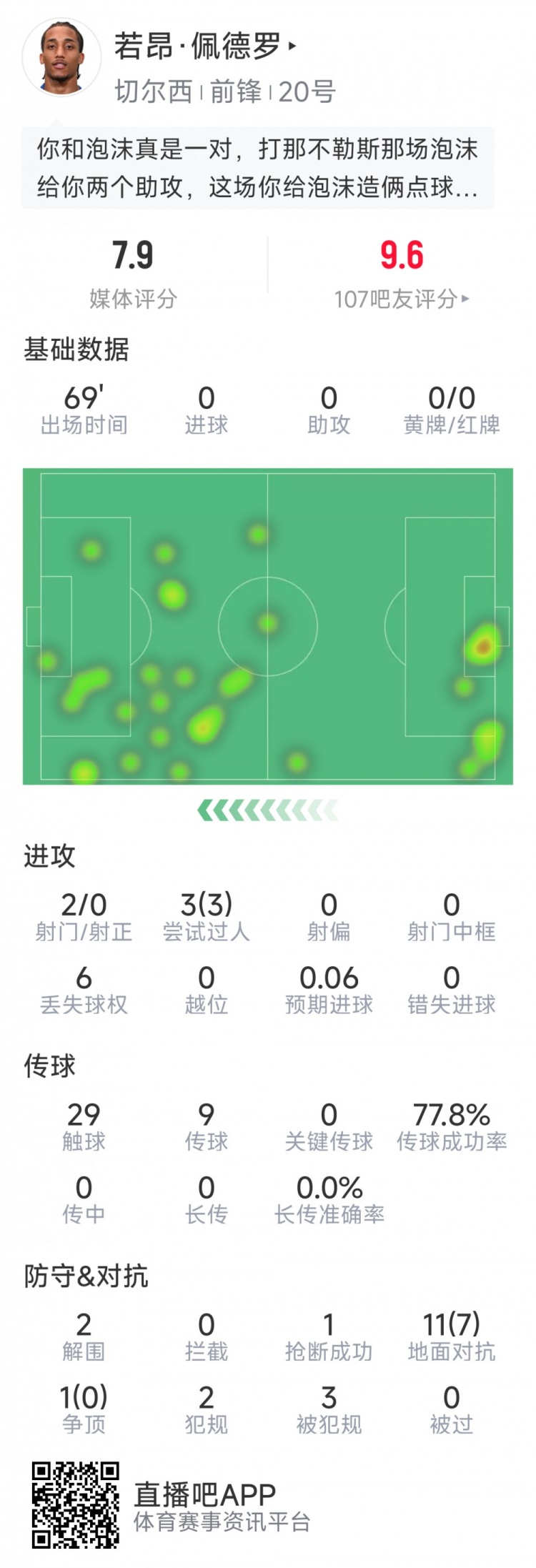 24直播网2月8日讯 在本轮英超切尔西对阵狼队比赛中,若昂·佩德罗两次制造点球,以下为他在本场数据: