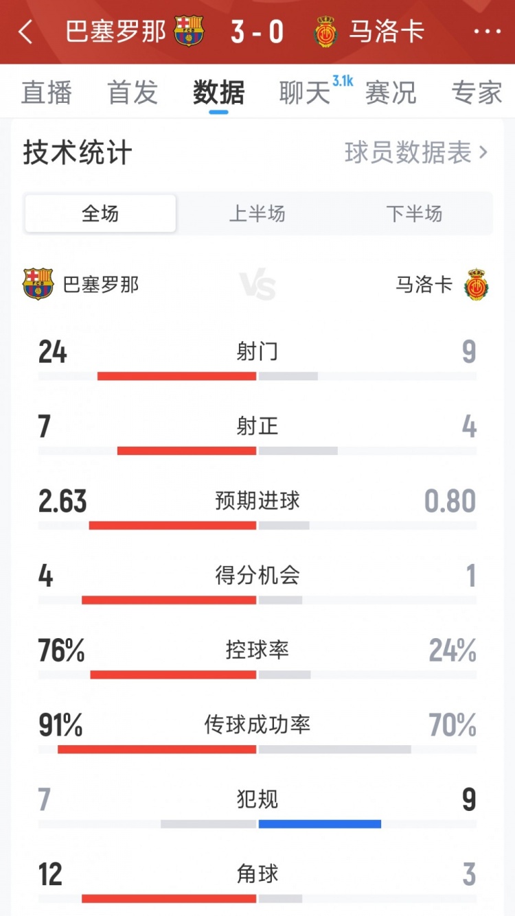 24直播网2月8日讯 在本轮西甲,巴萨3-0大胜马洛卡,以下为双方全场数据对比:
