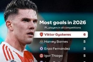 24直播网2月8日讯 在本轮英超,阿森纳3-0击败桑德兰,约克雷斯梅开二度。以下为英超球员在2026年各项赛事进球榜,其中约克雷斯居首。