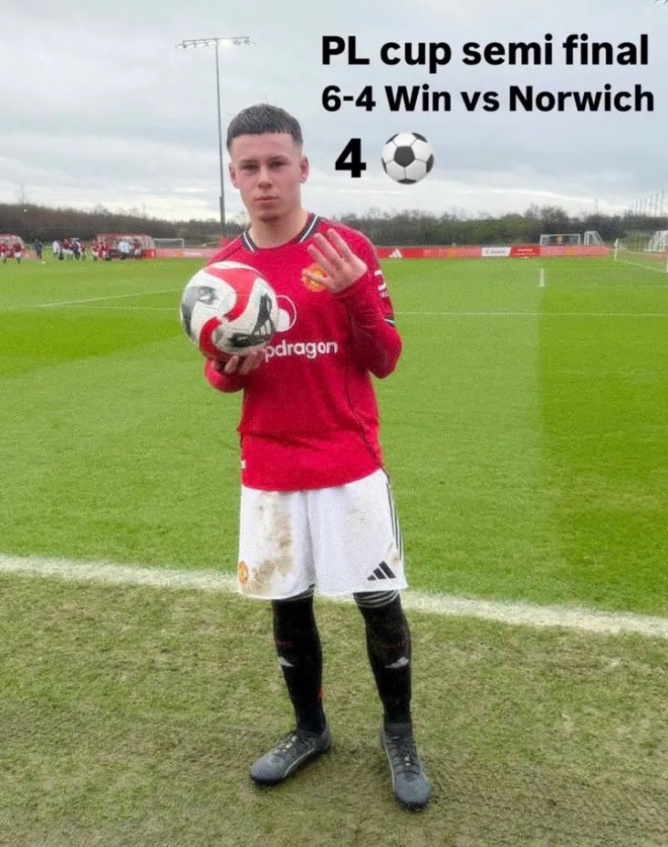 24直播网2月8日讯 据《太阳报》报道,在曼联提供职业合同几天后,俱乐部传奇射手鲁尼之子凯·鲁尼单场比赛上演了大四喜。这是一场曼联U16对阵诺维奇的比赛,最终曼联U16以6-4的比分取胜。