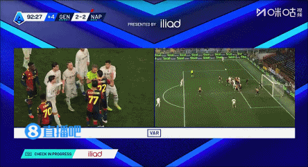 24直播网02月08日讯 那不勒斯vs热那亚第95分钟,维尔加拉造点,霍伊伦点射打进,此时比分变为3-2!