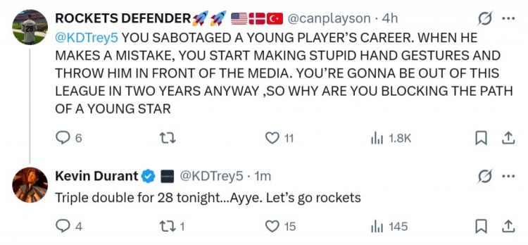 杜兰特:28号(申京)今晚得到了三双,好极了。冲啊火箭。