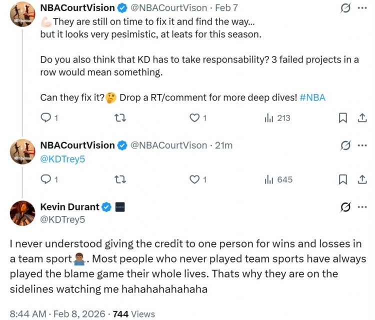 网友:他们(火箭)还有时间去修正并找到出路……但至少在这个赛季,情况看起来非常悲观。你是否也认为杜兰特需要承担责任?连续三个赛季的失败意味着一些问题。他们能解决这个问题吗?