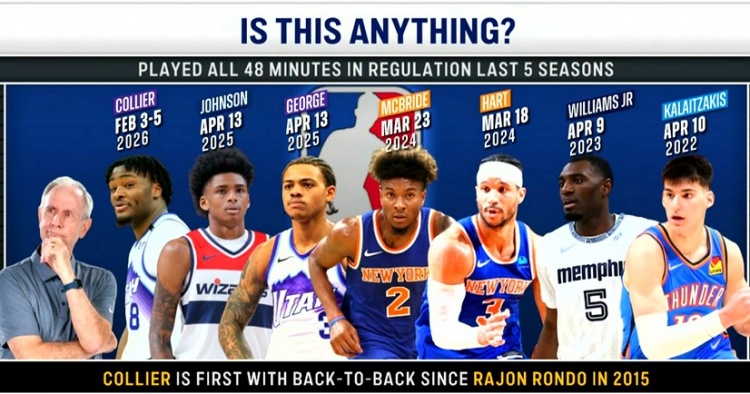 过去5个赛季打满48分钟的球员:奇才约翰逊和爵士基昂特·乔治在2025年4月13日打满;尼克斯麦克布莱德在2024年3月23日打满;尼克斯哈特在2024年3月18日打满;灰熊文斯·威廉姆斯在2023年4月9日;雷霆卡莱察基斯2022年4月10日打满。