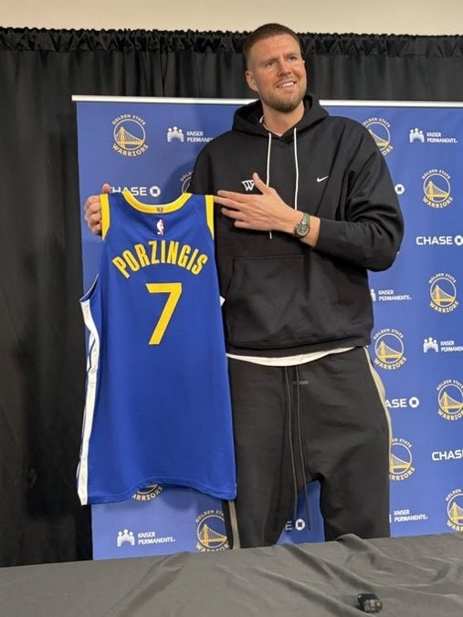 波尔津吉斯手持勇士7号球衣正式亮相。
