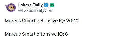 湖人自媒体Lakers Daily发文点评道:斯马特防守智商:2000;进攻智商:6。