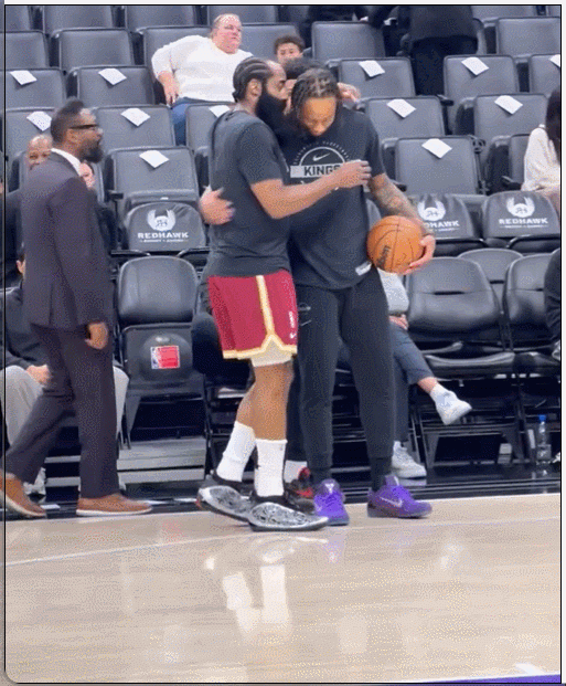 本场比赛是哈登的骑士生涯首秀,他赛前和2009届的同级生德罗赞耳语寒暄。