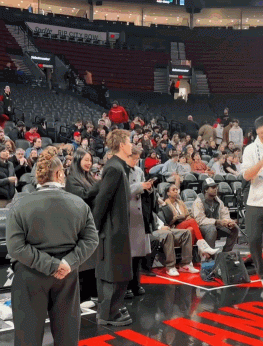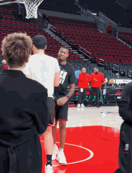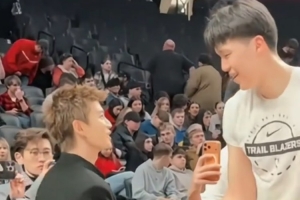 24直播网2月8日讯 今日上午开拓者主场背靠背再战灰熊,赛前演员任嘉伦来到场边给杨瀚森加油,与其握手聊天。