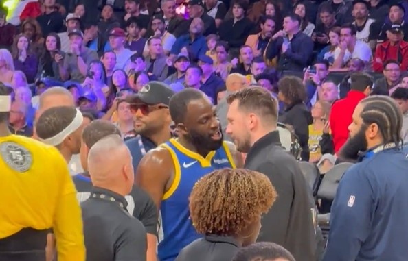 GIF-追梦场边狂喷东契奇 之后两人全笑了