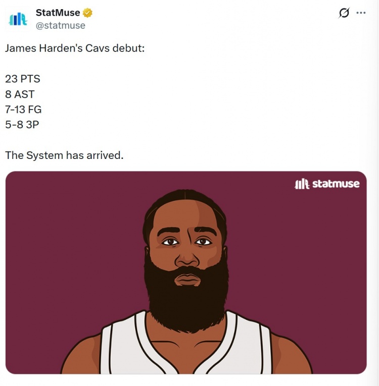 赛后,美媒StatMuse晒出了哈登数据,并写道:“体系已经到来。”