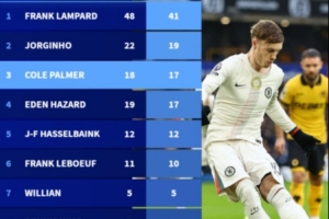 24直播网2月8日讯 在本轮英超切尔西3-1击败狼队的比赛中,帕尔默点射双响,德转也盘点了切尔西球员在英超点球进球榜,帕尔默第三,具体如下:
