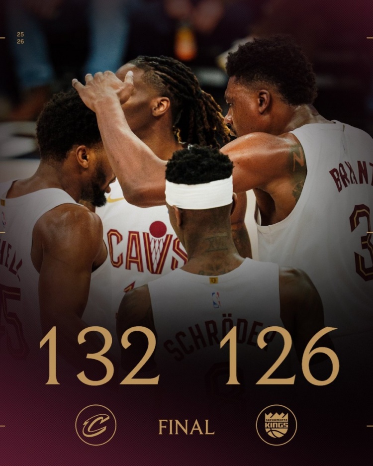 赛后,骑士官推发布赢球海报,封面有四位球员,分别是米切尔、托马斯·布莱恩特,以及两位新援后卫施罗德和基翁·埃利斯。