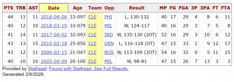 詹姆斯生涯至今6次40+三双,都是骑士时期得到的。