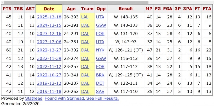 东契奇生涯至今10次砍下40+三双,其中2022年12月对阵尼克斯,他砍下60分21篮板10助攻。