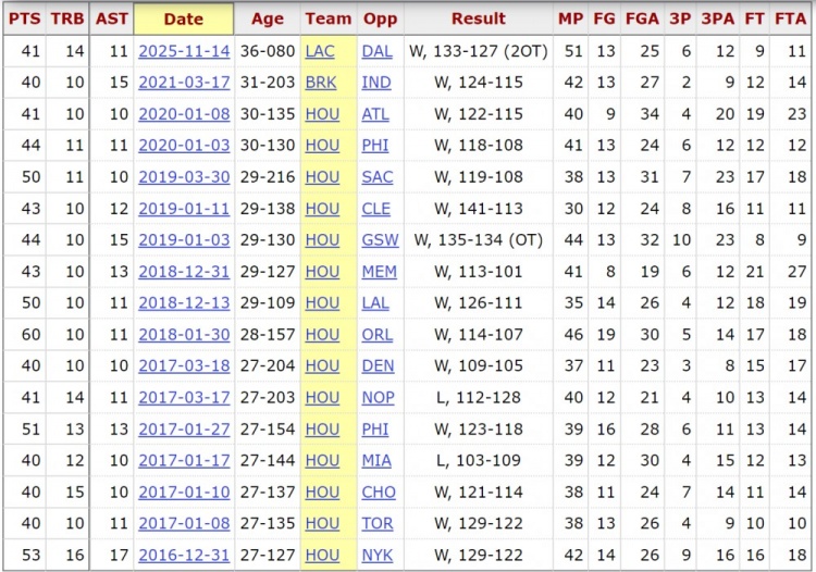 哈登生涯至今17次40+三双,其中包括一次60分10篮板11助攻,还有一次53分16篮板17助攻。