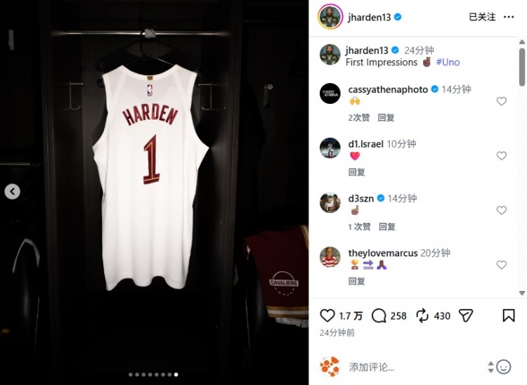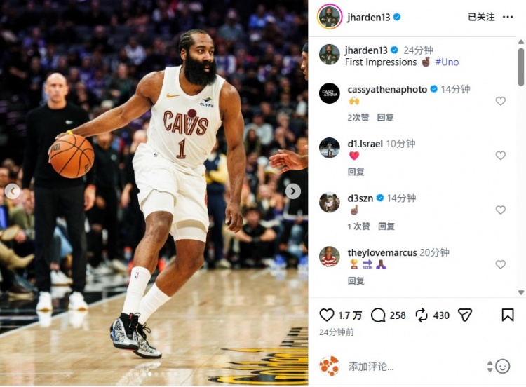 赛后,他更新社媒,晒出了多张本场比赛的照片,其中包括与好友Travis Scott的庆祝、与米切尔庆祝、骑士更衣室等多个瞬间,哈登写道:“第一印象。”