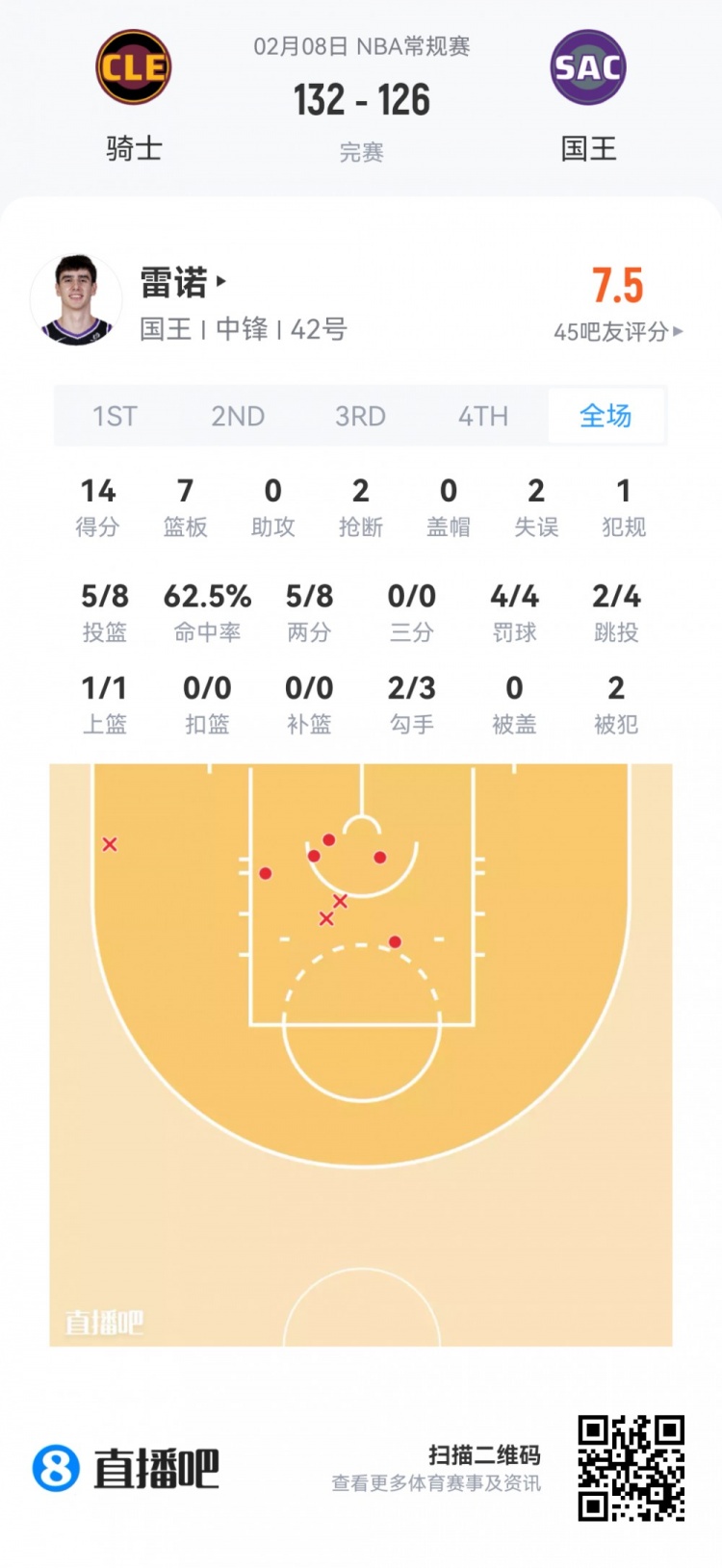 国王次轮42号秀雷诺 登场22.8分钟
