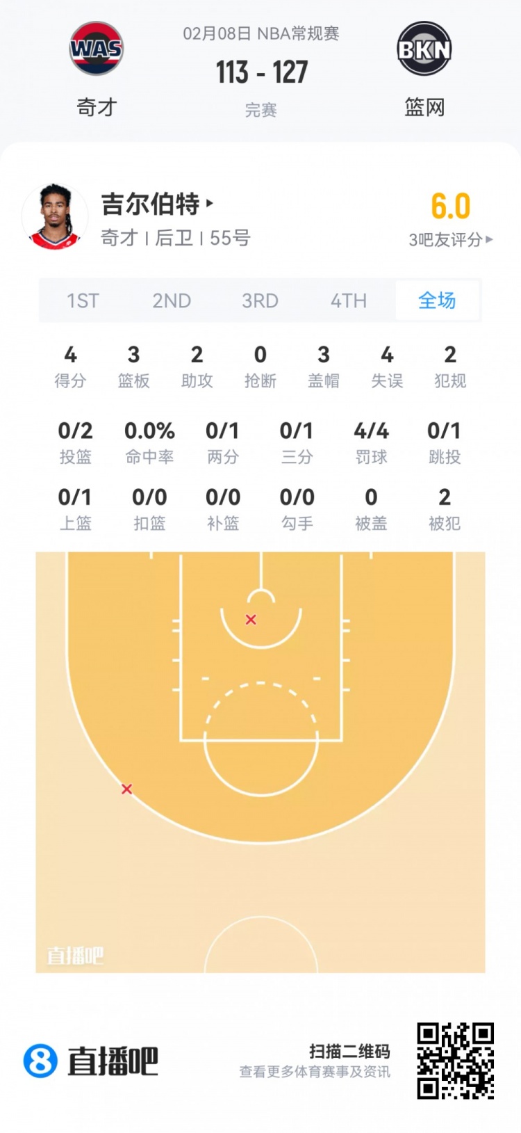 奇才落选秀吉尔伯特 登场28.7分钟