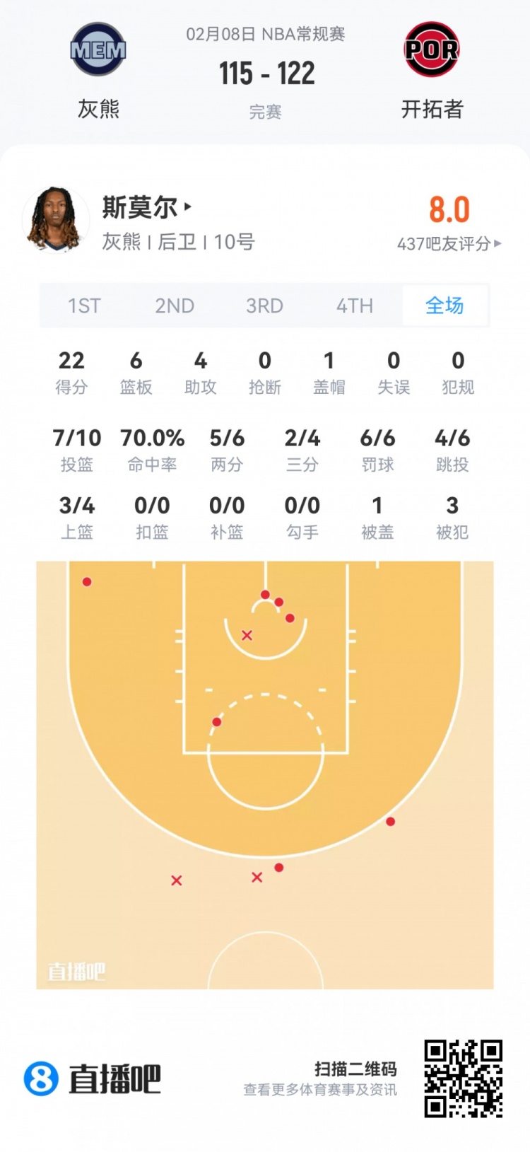 灰熊次轮48号秀斯莫尔 登场27.6分钟