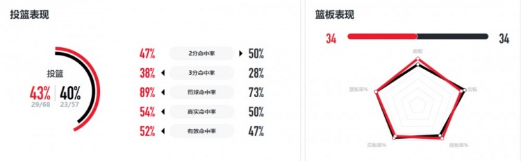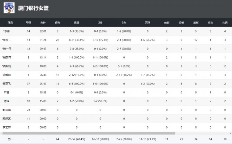 球队方面,厦门银行投篮命中率与对手相差不大,但三分球命中率28%比对手37.5%低,且命中个数也比对手少5分;总篮板数双方一样多都是34个,前场篮板也差不多;助攻方面厦门女篮14-12还多2次;失误方面,厦门银行出现18次,而北京女篮仅9次。球员方面,外援马歇尔依然拿到22分12篮板的两双,但投篮21中8效率不高;国内球员蔡亚飞最为亮眼6投全中拿到13分8篮板;郑馨茹虽然有12分入账,但三分11中2;另外赖一丹、杨梦萍、李彤、肖婉钰和陈瑶等球员都有得分入账。