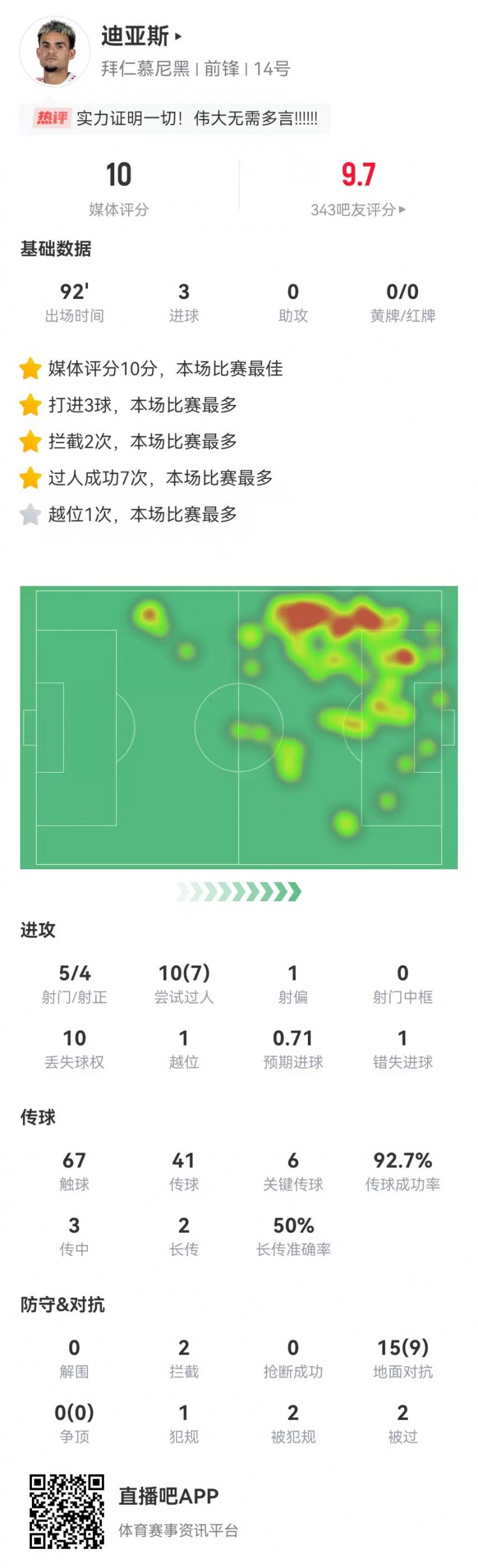 24直播网2月9日讯 拜仁在本轮德甲5-1大胜霍芬海姆,迪亚斯本场数据如下: