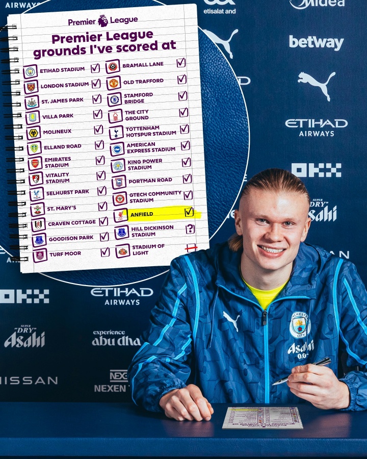 哈兰德首次在安菲尔德进球,英超出战过的24个球场,他已攻破23个球场大门,只剩埃弗顿新球场——希尔·迪金森球场还未进球。