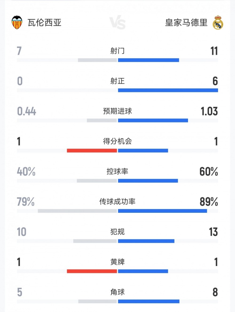24直播网2月9日讯 本轮西甲,皇马2-0客胜瓦伦西亚。双方全场重点数据对比如下↓(主队瓦伦西亚在前)