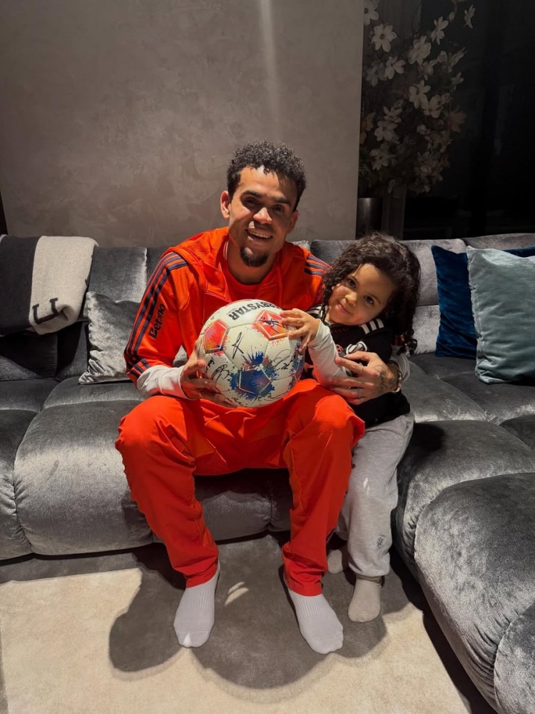 路易斯·迪亚斯带走了比赛用球,他晒出了自己和女儿一起捧着球的合照。