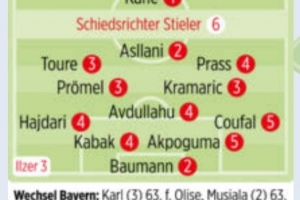 24直播网2月9日讯 德甲第21轮比赛,拜仁主场5-1击败霍芬海姆,德国媒体《图片报》对两队球员进行了评分。