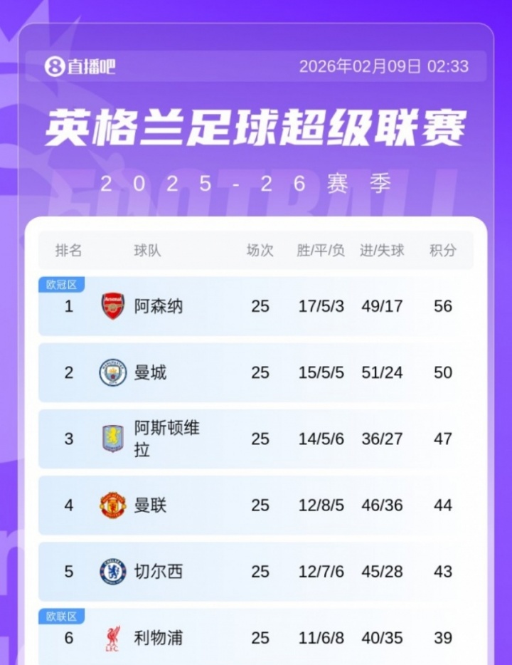 英超第25轮,利物浦1-2曼城。至此本轮英超所有比赛均已结束!来看看最新的积分榜形势。