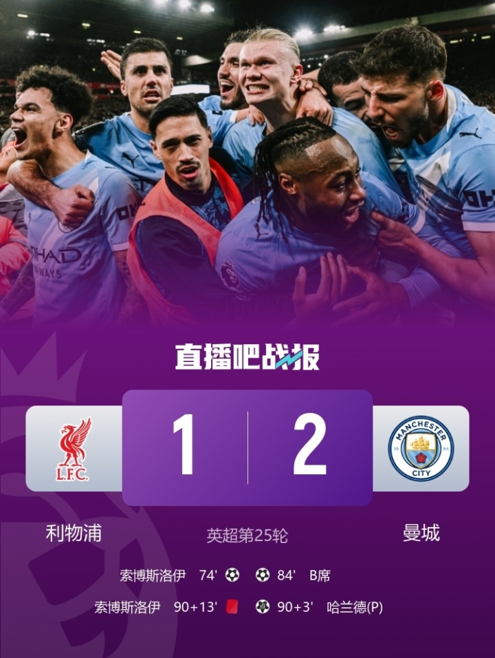 双杀!曼城2-1逆转利物浦距榜首6分 哈兰德传射索博世界波+染直红
