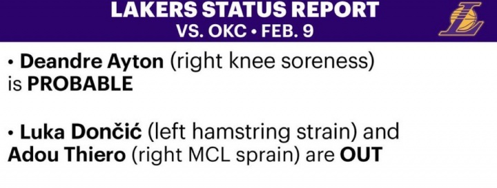24直播网02月09日讯 湖人更新了明日主场战雷霆的伤病报告。