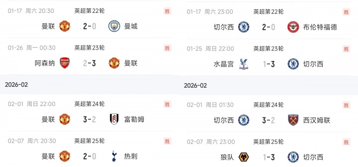 24直播网02月09日讯 英超第25轮全部战罢,切尔西和曼联本轮均取胜。