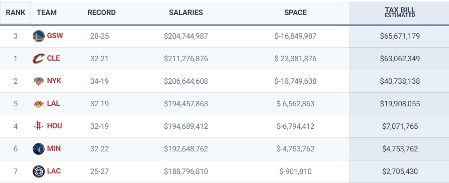 24直播网02月09日讯 薪资网站Spotrac再度更新NBA各队的奢侈税金额,其中7队需要缴纳,23队参与分红。