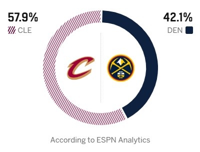 ESPN预测本场胜率:骑士57.9%,掘金42.1%。