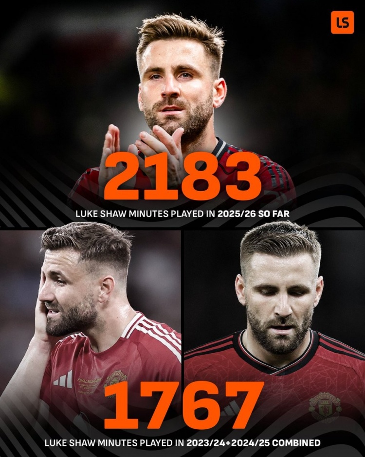 数据统计显示,卢克·肖本赛季已出场2183分钟,而他在此前2个赛季共计仅出战1767分钟。