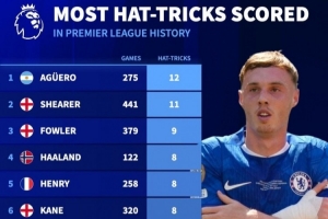 24直播网2月10日讯 切尔西在本轮英超3-1击败狼队,帕尔默上演帽子戏法,《转会市场》统计显示帕尔默已经在英超4次戴帽,位列联赛历史第16位。